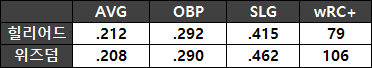 하지만 이것만으로 2026시즌 힐리어드가 2025시즌 위즈덤보다 못 할 것이라는 결론을 도출할 수는 없다. 우선 2025시즌 위즈덤의 성적은 최악은 아니었다. 하지만 MLB 경력을 기반으로 받은 기대에는 미치지 못한 성적이었다.