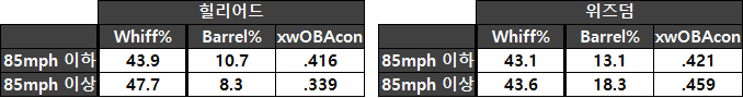 두 번째는 MLB와 KBO리그의 포심-싱커 비율 차이다. 힐리어드는 포심보다 싱커에 크게 더 약하다. 싱커에 더 강했던 위즈덤과는 또 반대다.