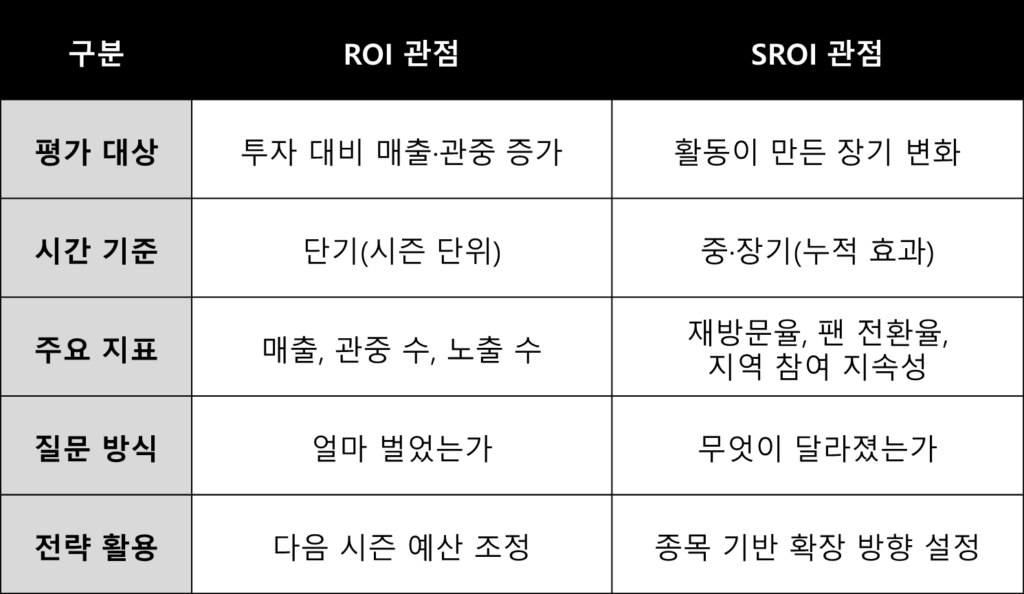 여기에서 ‘SROI(Social Return on Investment)’라는 관점이 필요하다. SROI는 스포츠가 만들어내는 가치를 단기 수익이 아니라 장기 기반의 변화로 살펴보는 방식이다.